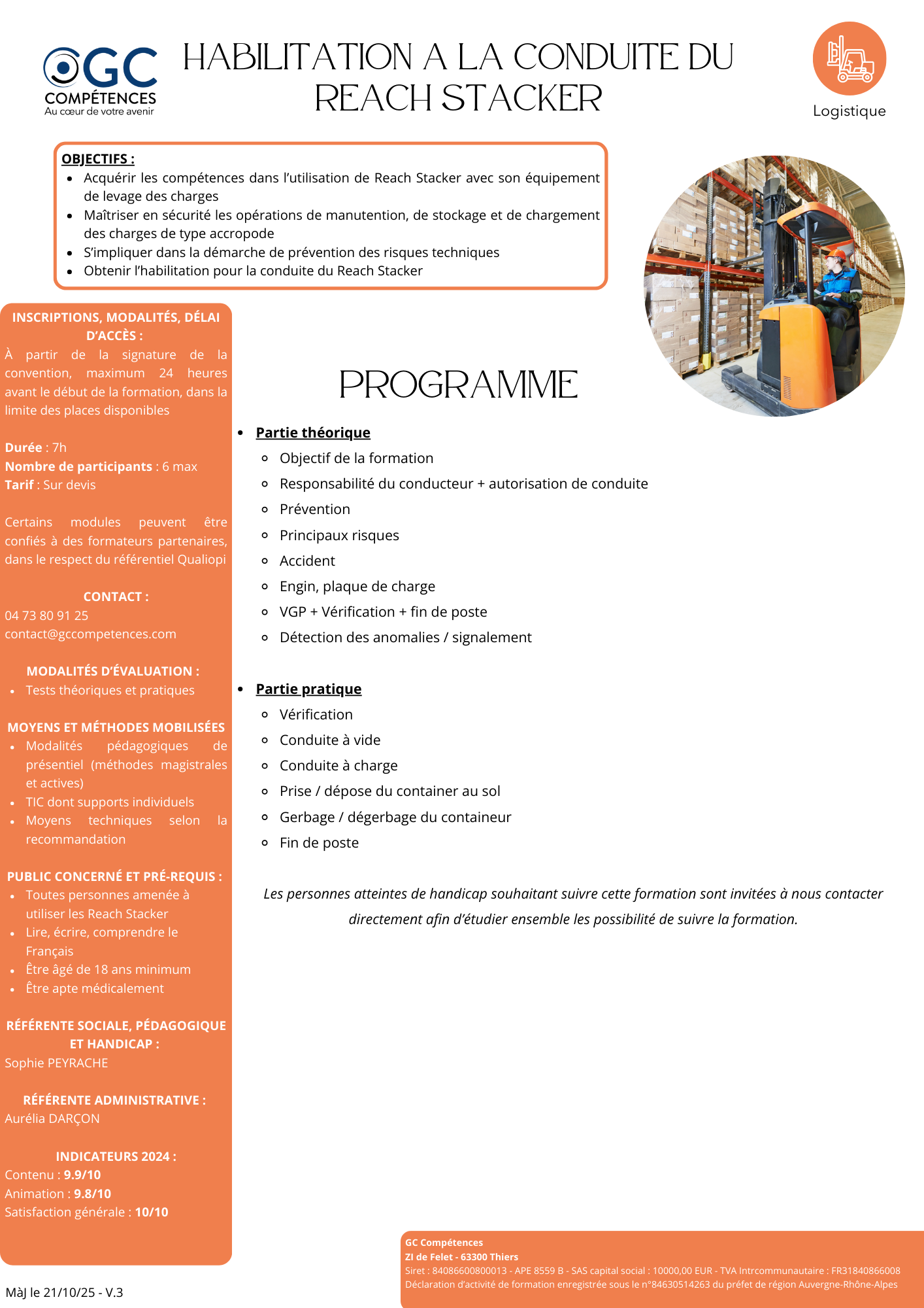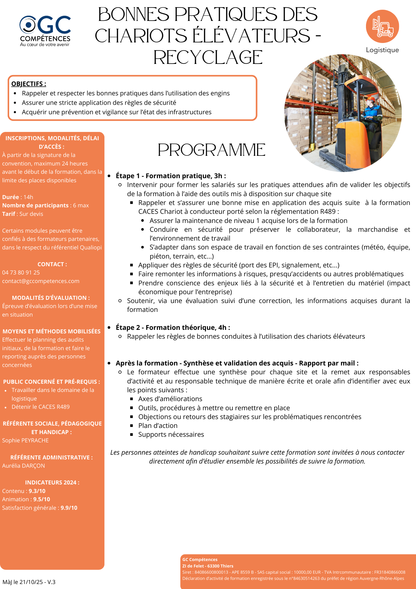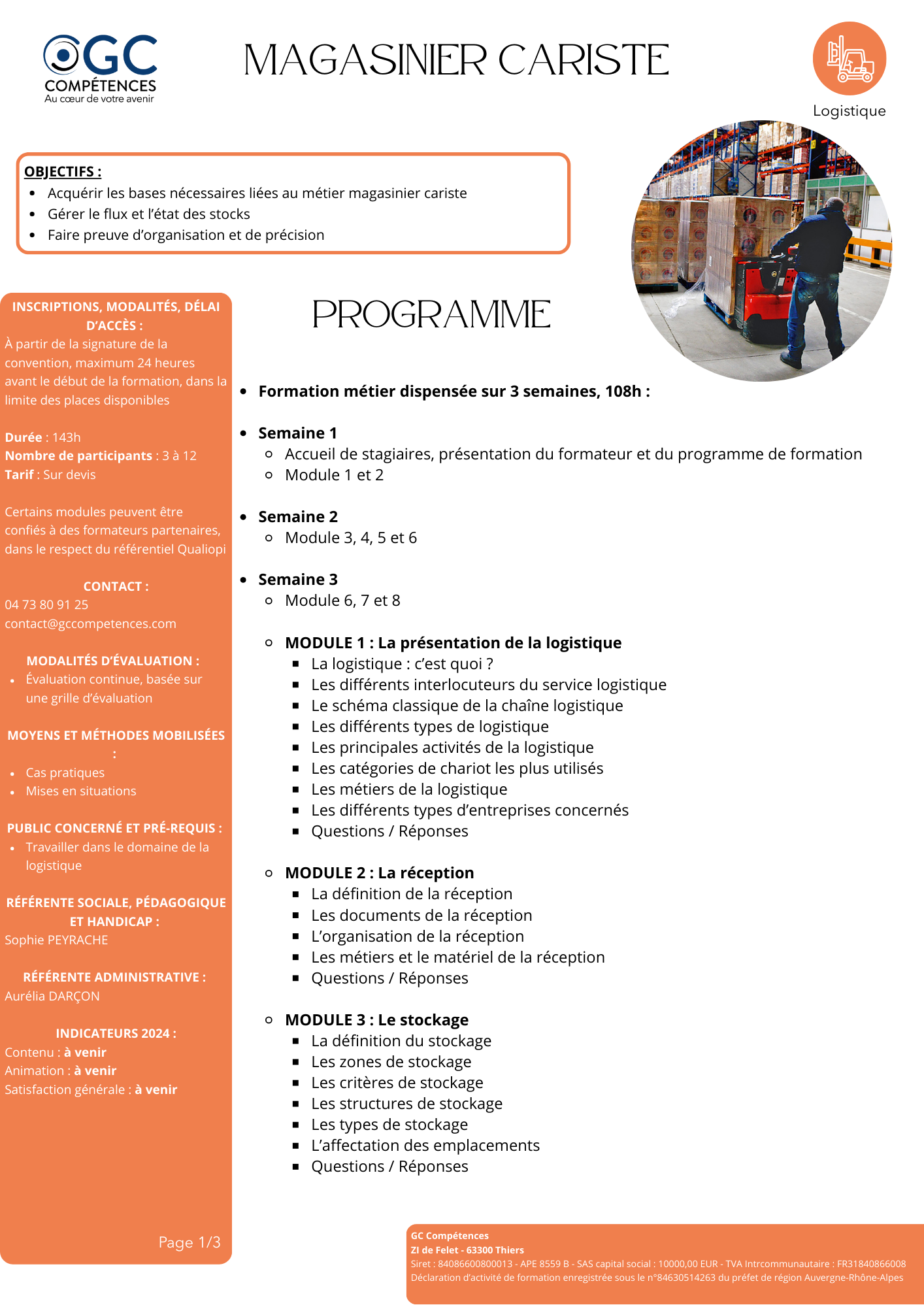 La Logistique est un domaine clef qui favorise la performance des organisations : il s'agit d'optimiser les flux de produits (approvisionnement, distribution, gestion des stocks, traçabilité, ...) tout en maîtrisant les exigences de sécurité et d'entretien du matériel. GC Compétences propose et développe des formations "métier" dédiées à ce secteur, dans l'optique de garantir une montée en compétences efficace et immédiatement opérationnelle. A ce jour, les formations que nous vous proposons sont les suivantes : - Magasiniser Cariste sur 143 heures (dont 21 heures de CACES R 489 1B, 3 et 5 en lien avec notre partenaire DRT Formation) ; - Bonnes Pratiques des Chariots Elévateurs sur 14 heures. |