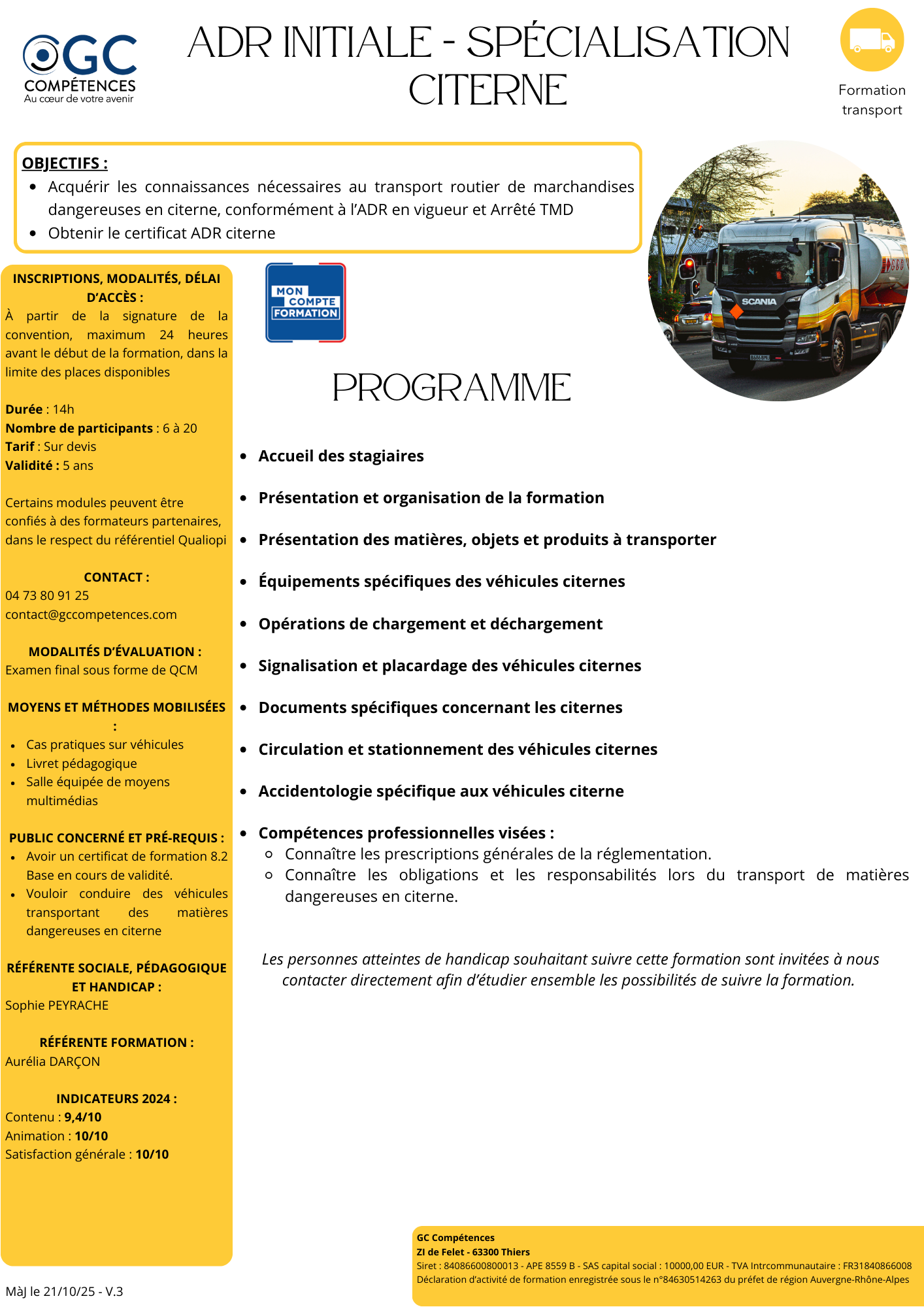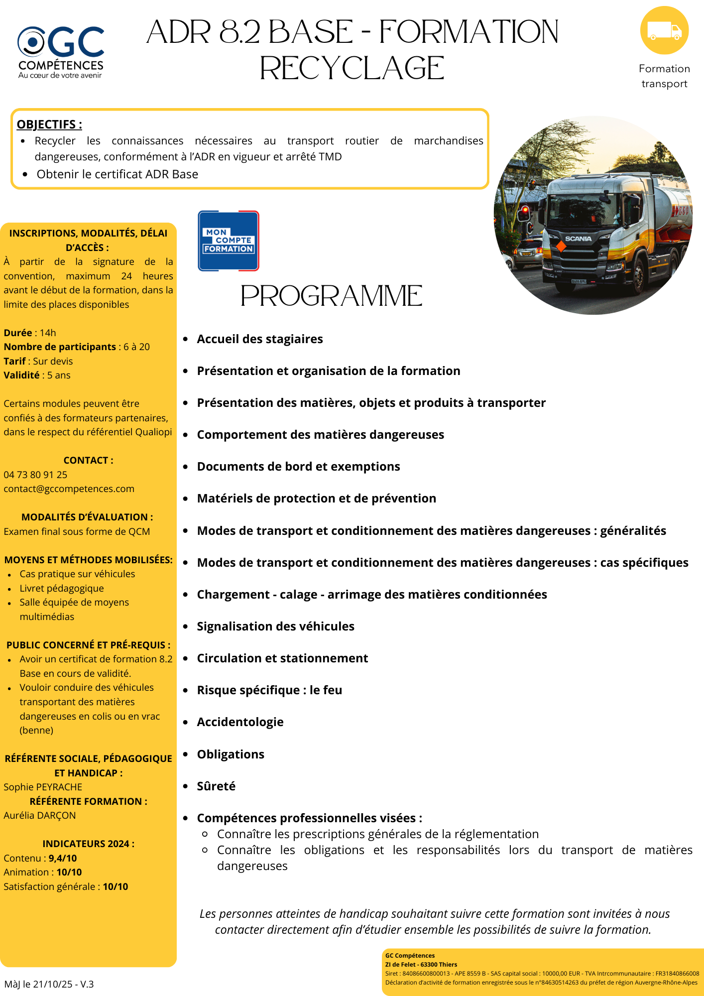 Le secteur des Transports est vaste et comprend de multiples possibilités de carrières. Parmi tous les métiers proposés, le Transport de Marchandises est un domaine recherché. Une formation pour obtenir les aptitudes nécessaires afin d’accéder aux postes de conducteur.rice de poids lourds est indispensable. Il s’agit de maîtriser le véhicule et de connaître parfaitement les règles de sécurité. Dans le détail, le conducteur.rice prépare et réalise des transports régionaux et nationaux au volant de véhicules dits lourds ainsi que les opérations administratives associées Pour un conducteur.rice novice, il faut donc s’orienter vers la formation FIMO (Formation Initiale Minimale Obligatoire) Marchandises délivrée par GC Compétences. Celle-ci se compose de modules théoriques et pratiques, s’étalant sur 140 heures. Une fois la formation FIMO obtenue, elle doit se recycler tous les cinq ans pour valider à nouveau les acquis. Ce recyclage s’appelle la FCO (Formation Continue Obligatoire) Marchandises et permet de valider à nouveau les acquis. Celle-ci est également délivrée par GC Compétences, dure 35 heures et est primordiale pour les conducteur.rice.s de véhicules de transport de marchandises de plus de 3,5 tonnes. A noter : nous dispensons également les FCO Marchandises Passerelles pour les conducteur.rices qui auraient une FIMO ou FCO voyageurs en cours de validité et qui voudraient s'orienter vers le transport de marchandises. Cette formation dure également 35h. Ces cursus permettent au conducteur.rice de disposer ou de réactualiser les connaissances et la pratique nécessaires en matière de sécurité et de réglementation. | Aussi, GC Compétences propose des formations dans le cadre du Transport de Matières Dangereuses. L'ADR (Accord européen relatif au transport international des marchandises Dangereuses par Route) est une formation obligatoire pour tout transport de marchandise présentant un risque pour l'homme ou l'environnement. Ces formations se renouvellent tous les 5 ans. Voici la liste des formations dispensées dans ce cadre : - L'ADR 8.2 Base - initiale et recyclage sur respectivement 21 heures et 14 heures ; - L'ADR 1.3 Exploitant sur 3.5 heures ; - L'ADR Spécialisation produits pétroliers - initiale et recyclage sur respectivement 14 heures et 7 heures ; - L'ADR Spécialisation citerne - initiale et recyclage sur respectivement 14 heures et 7 heures. Enfin, GC Compétences propose des formations complémentaires pour assurer le perfectionnement des connaissances du monde du Transport de Marchandises par voie terrestre : - L'Arrimage et Sanglage (Sécurisation des Charges pendant le transport) sur 4 heures ; - La RSE Transport (Réglementation Sociale Européenne) sur 3 heures pour tous les poids lourds de plus de 3.5 tonnes, à destination des exploitants transports ; - L'éco-conduite sur 7 heures (plus d'informations sur notre site, dans l'onglet "Formations et Stages"/"Ecologie & Environnement") |