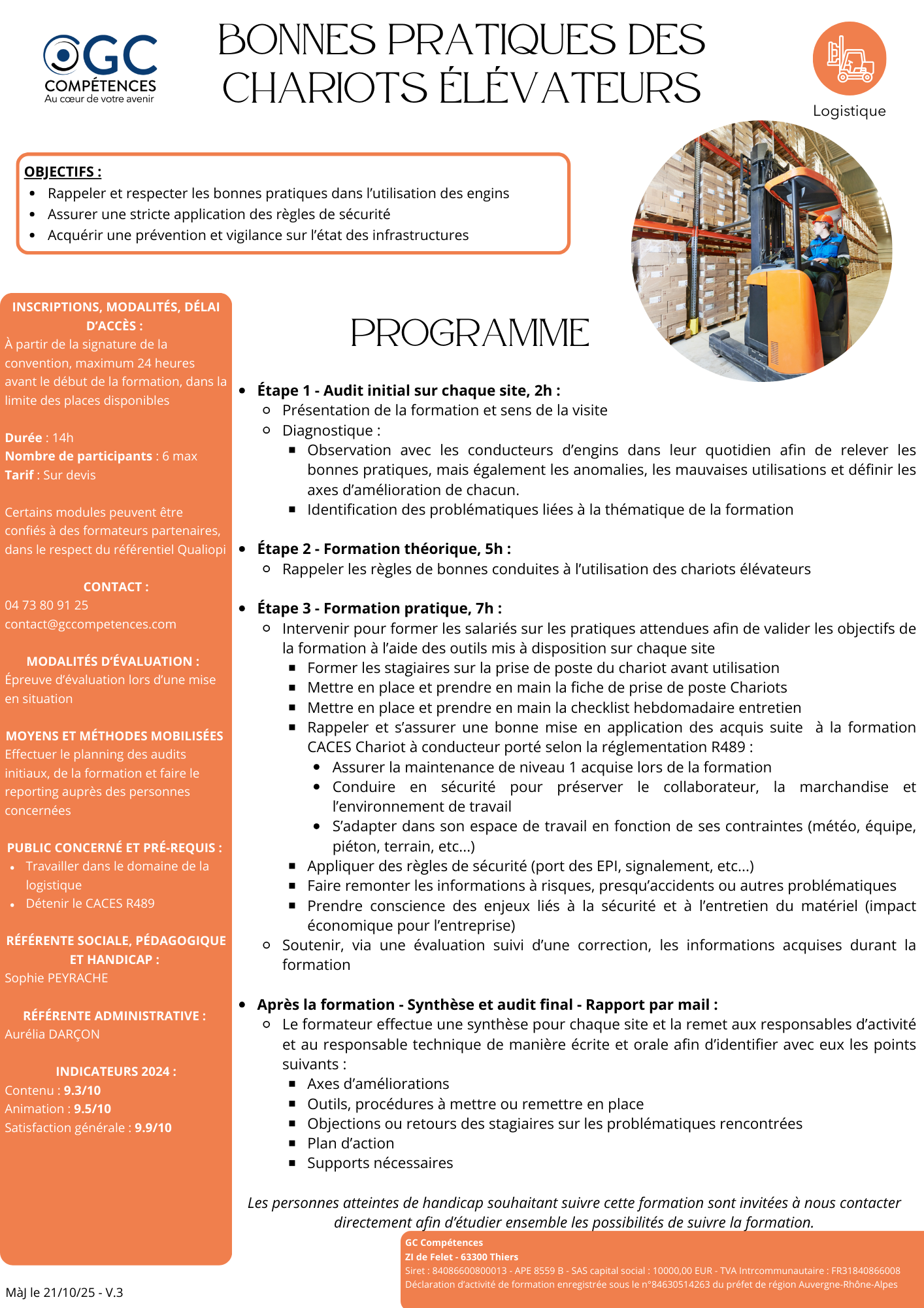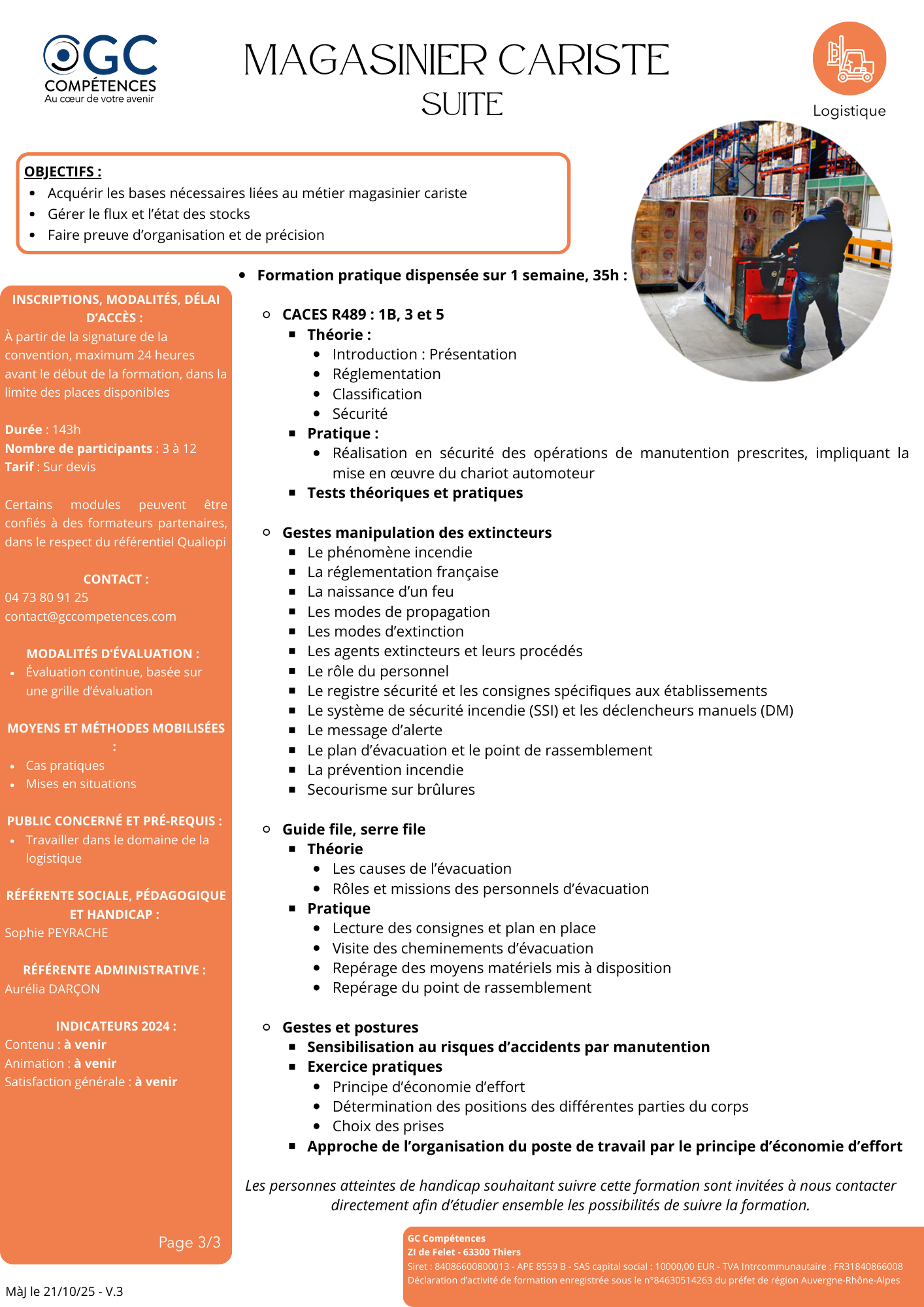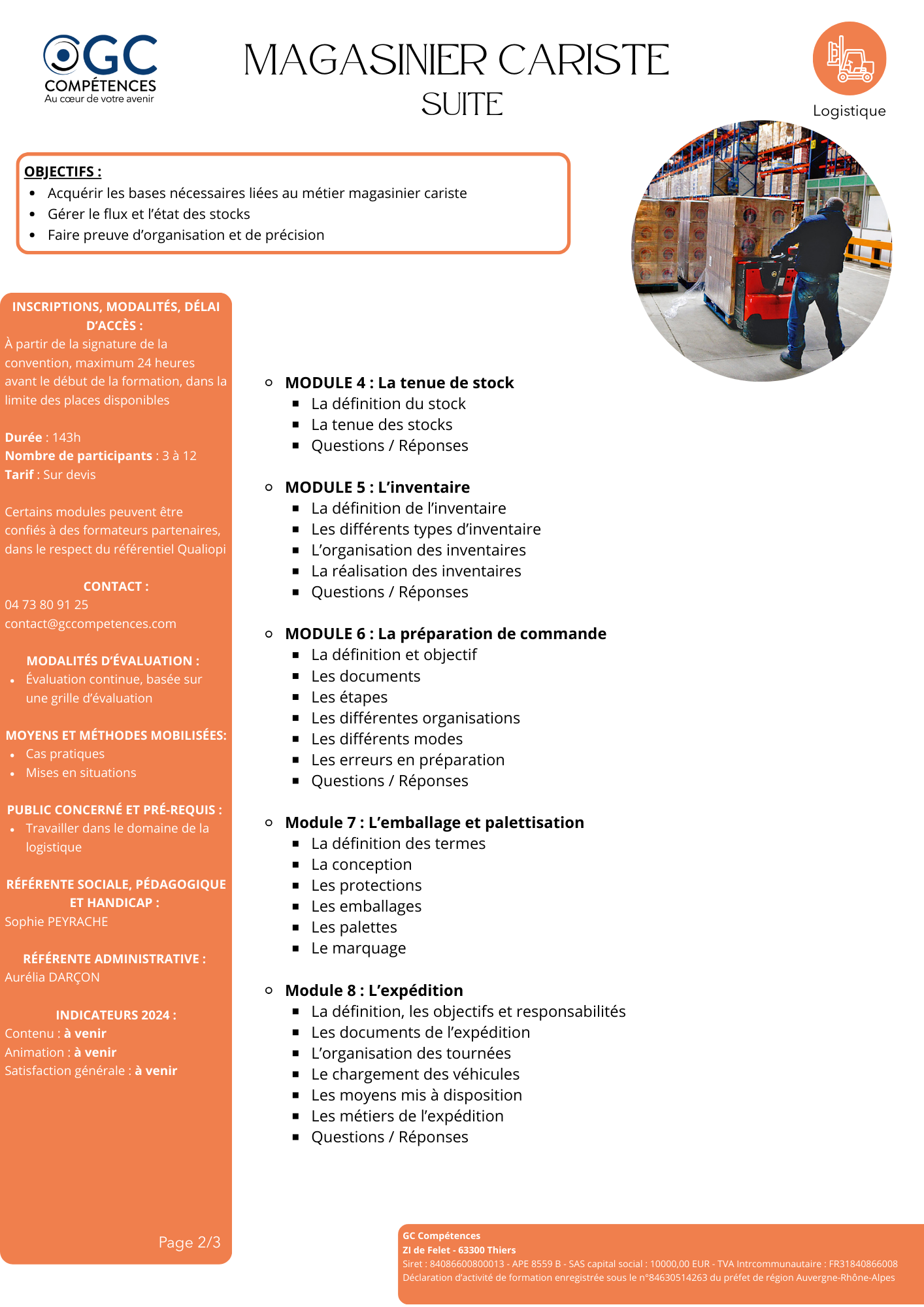 La Logistique est un domaine clef qui favorise la performance des organisations : il s'agit d'optimiser les flux de produits (approvisionnement, distribution, gestion des stocks, traçabilité, ...) tout en maîtrisant les exigences de sécurité et d'entretien du matériel. GC Compétences propose et développe des formations "métier" dédiées à ce secteur, dans l'optique de garantir une montée en compétences efficace et immédiatement opérationnelle. A ce jour, les formations que nous vous proposons sont les suivantes : - Magasiniser Cariste sur 143 heures (dont 21 heures de CACES R 489 1B, 3 et 5 en lien avec notre partenaire DRT Formation) ; - Bonnes Pratiques des Chariots Elévateurs sur 14 heures. |